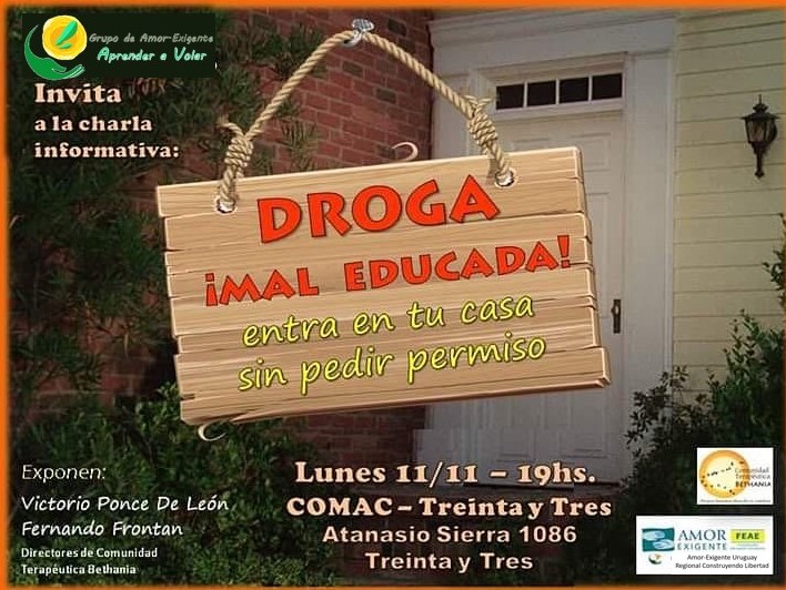 Grupo Aprender a Volar los invita a una charla informativa, “Droga Mal Educada, entra en tu casa sin pedir permiso”, el día 11 de noviembre, 19 hs. en Treinta y Tres Expositores: Victorio Ponce de León y Fernando Frontán(Directores Comunidad Terapéutica Bethania)